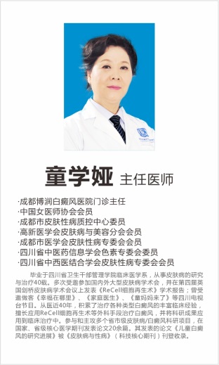 毕业于四川省卫生干部管理学院临床医学系,从事皮肤病的研究与治疗40载。多次受邀参加国内外大型皮肤病学术会,并在第四届英国剑桥皮肤病学术会议上发表《ReCell细胞再生术》学术报告;曾受邀做客《幸福在哪里》、《家庭医生》、《童妈妈来了》等四川电视台节目。从医近40年,积累了治疗各种类型白癜风的丰富临床经验,擅长应用ReCell细胞再生术等外科手段治疗白癜风,并将科研成果应用到临床治疗中。参与和主攻多个省市级皮肤病/白癜风科研项目,在国家、省级核心医学期刊发表论文20余篇。其发表的论文《儿童白癜风的研究进展》被《皮肤病与性病》(科技核心期刊)刊登收录。